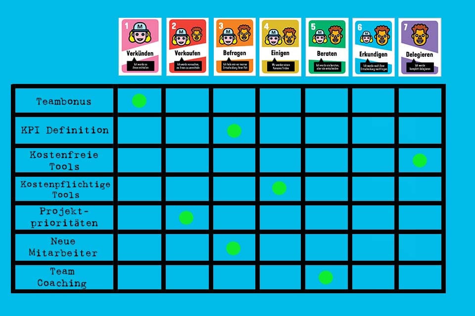 Es gibt sieben Karten, die für unterschiedliche Delegationsstufen stehen: