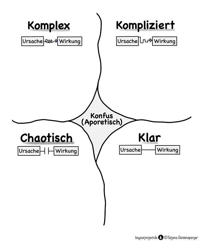 - Hier ergeben sich Fragen und Herausforderungen, die sich plötzlich vorhanden, sich auf ein gesamtes System auswirken und Entscheider überwältigen, wie zum Beispiel das Wetter mit einer noch nie dagewesenen Flut. Unordnung bestimmt dieses Feld. Sofortiges Handeln und Schadensbegrenzung ist die einzige Option. Es gibt somit keine Beziehung zwischen Ursache und Wirkung. Hier gilt: Handeln (nach Instinkt) – Erkennen – Reagieren.