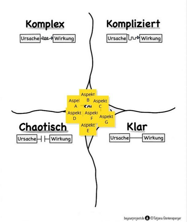 c) In dem Feld „Komplex“ werden alle Aspekte untergebracht, bei denen die Unsicherheit groß ist. Es gibt möglicherweise viele verschiedene Ansätze oder man kann nicht mit Sicherheit sagen, ob der Ansatz funktionieren wird. Es können Wechselwirkungen auftreten, Vorhersagen sind schwierig. Eine agile Vorgehensweise kann hier hilfreich sein, so werden iterativ mit Einbindung der Stakeholder Lösungen weiterentwickelt. Es wird gemäß der Handlungsempfehlungen besser sein, öfter auszuprobieren und zu erkunden als im Theoretischen zu verharren.